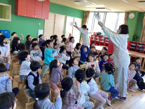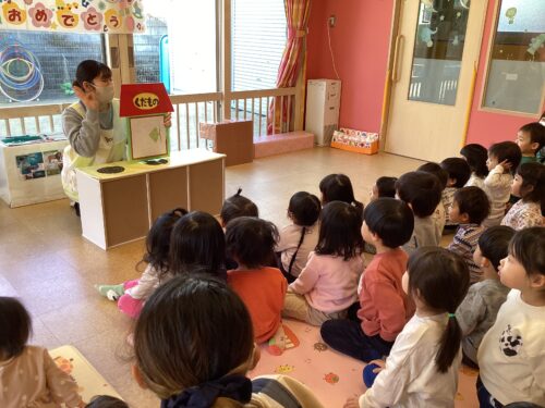 様々な果物がお店から出てきて、何が出てくるのかをみんなで当てて楽しんでいます♪♪ 「さくらんぼー!」や「もも〜!」など大きな声で答えてくれています。