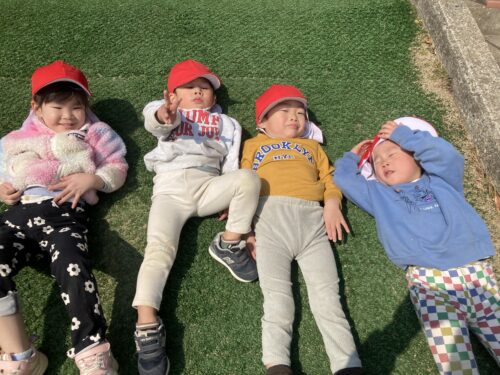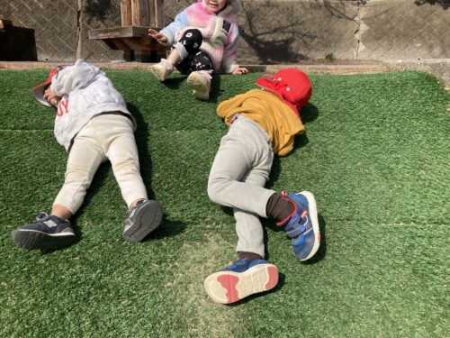 天気が良かったので芝生でゴロゴロと寝転んで、気持ちよさそうでした!芝生滑りもしてたくさん滑って楽しんでいます😊