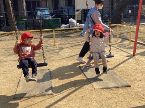 ブランコに乗り、ユラユラと揺らすと、『ちょっとこわい💦』と怖がっているお友達もいます😱