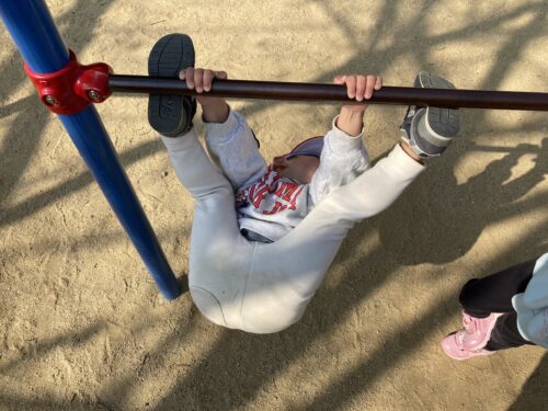 鉄棒につかまり、ぶらぶらとぶら下がったり、足を上げて足で支えたりして遊んでいます🎵