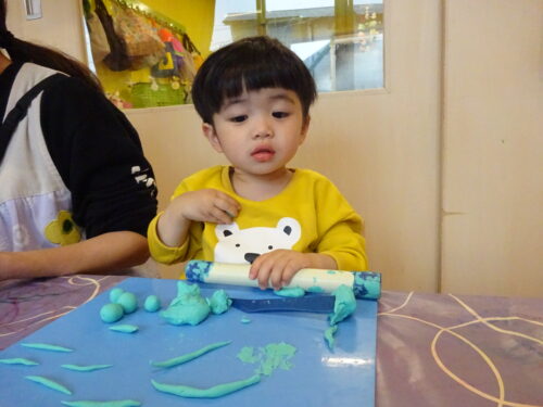 めん棒を使い粘土をコロコロしたり、細長く伸ばしてヘビを作り夢中です♪
