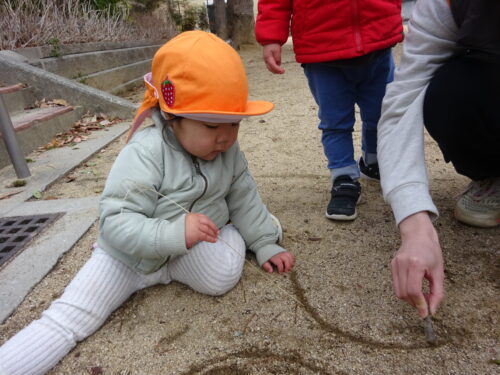 地面にお絵描きをしていると「あんぱんまん!」と嬉しそうで、保育士と一緒に枝でお絵描きをして夢中でした!「カレーパンマンかいて~」とリクエストもありました。