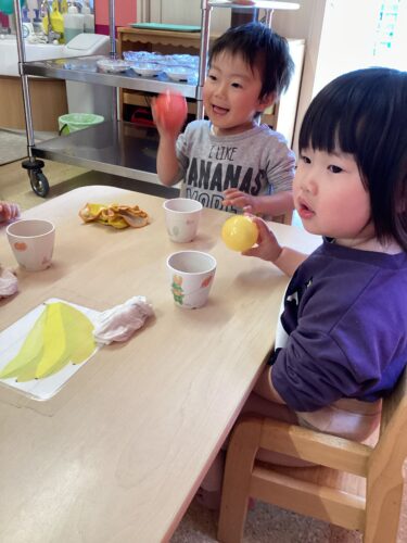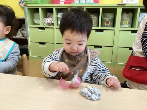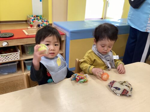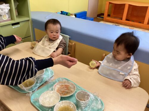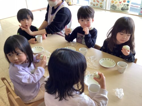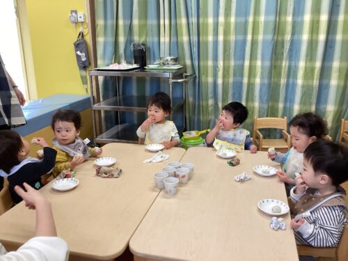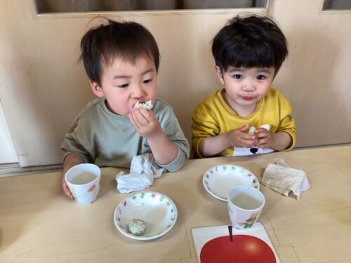 おやつの時間に、0.1.2歳児クラスがおにぎりを作りました🍙