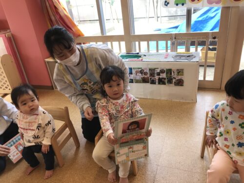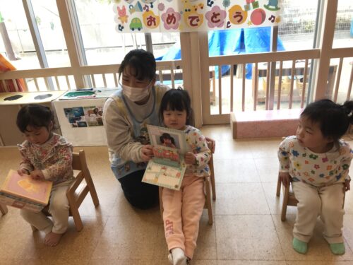 うみ組(0歳児)1名、だいち組(1歳児)1名、あめ組(2歳児)2名のお友だちが誕生日を迎えました♩