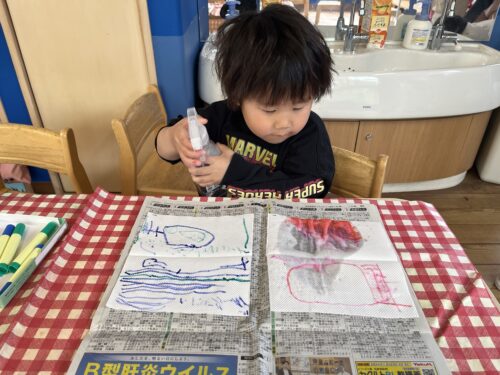 描き終わったものに、霧吹きで水をかけました。ペンの色が滲んでいくのを見て驚いた様子でした🫨シュッシュッと水が出てくるのが楽しかったようで夢中になっていました!
