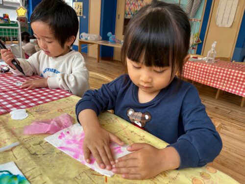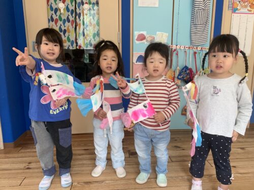 完成したものを嬉しそうに「できたよぉ〜!」と言って見せに来てくれました♪♪ 左右に振ると、こいのぼりがフワフワと揺れるのが楽しいようで、お友達と笑い合いながら振っていました😄