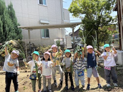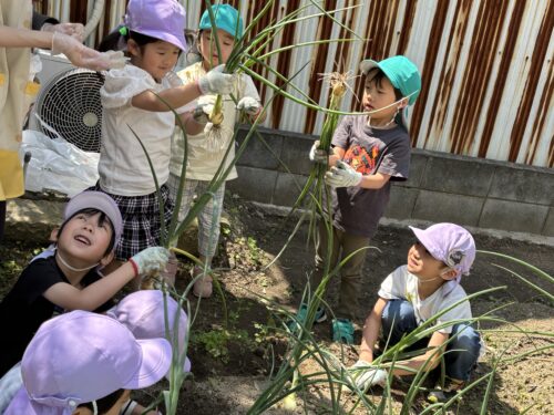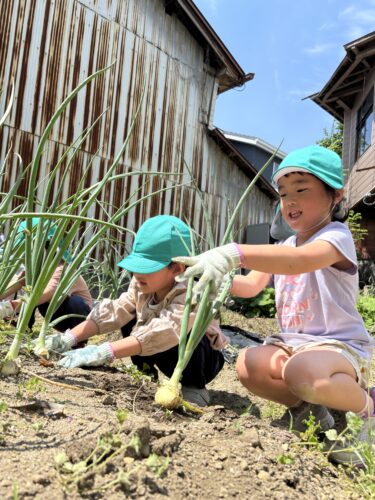 そら組(4歳児)、くじら組(5歳児)の子どもたちと畑に植えた玉ねぎを収穫しました!🌟
