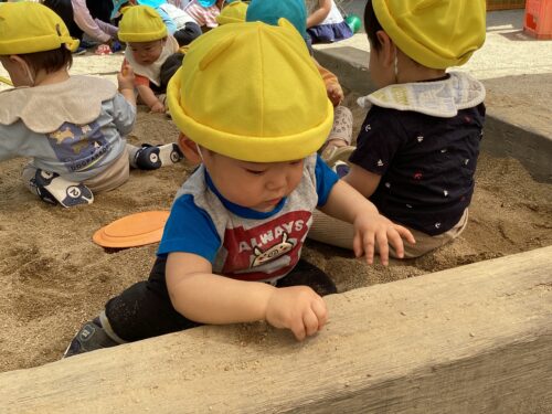スコップやカップを使って砂を掬ったり、『あ!』『ぱ!』と声を出して楽しく遊んでいました😊🌟