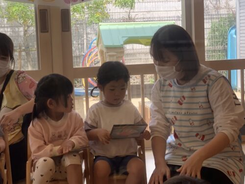 だいちぐみさん(1歳児)は少し恥ずかしがりながらもみんなにカードを見せてくれたり、写っている自分の顔を見て微笑んだりしながら、楽しんで参加しています🥰