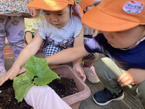 観察していると、、キュウリの花が咲いていることや、葉っぱの不思議な感触に気がつきました✨「ちくちくする〜!」「なんかふわふわや、、」と気づきを共有していました☺️