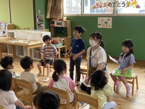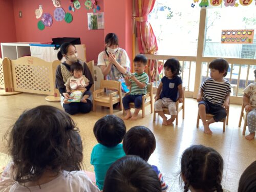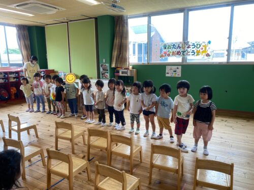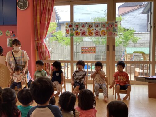 5月の誕生会でお休みだったお友達も含めて、うみ組(0歳児)1名、だいち組(1歳児)2名、あめ組(2歳児)3名のお友達をみんなでお祝いしました。