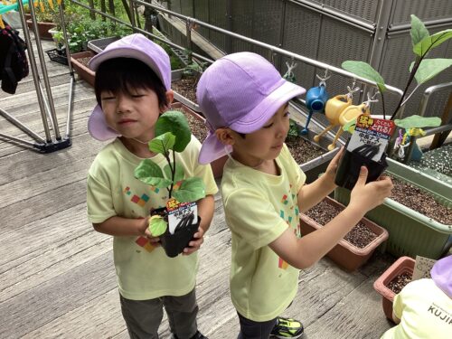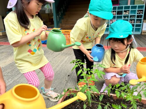 子どもたちと一緒に、夏野菜の苗植え、水やりをしました☺︎