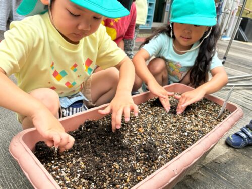 苗を「よいしょよいしょ!」と大事にくじら組さんがプランターまで運んでいます!