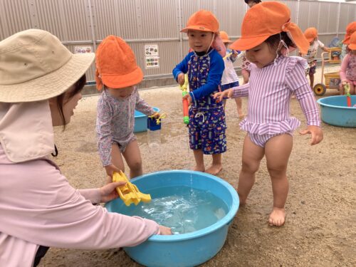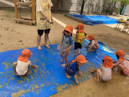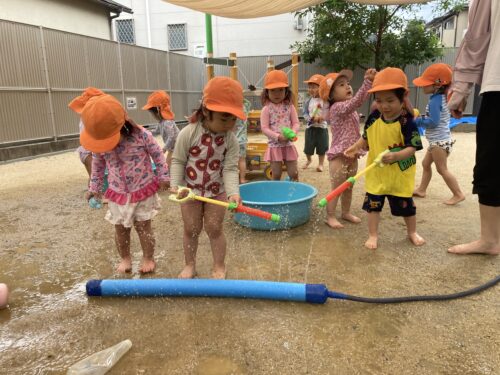 お友だちや保育士と「キャッキャ💕」言いながら、ぴちゃぴちゃ水を掛け合うことを楽しんでいます☺️暑い夏も水を浴びれば気持ちいいですね😏✨