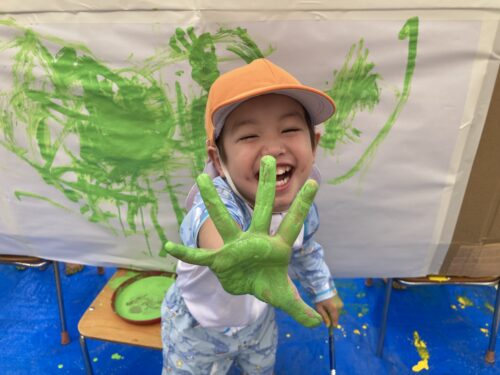 こちらは、ボディペインティングの様子です🎨上手にぬりぬりし、「手が緑やぁ😂」と、大爆笑しています😆汚れることを気にせず、大胆に遊べるのが嬉しいですね✨