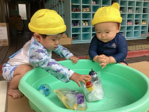 前日に玩具と一緒に凍らせた氷を見て『早く触りたい!』と手を伸ばしたり、遊ぶ前には保育者の話を聞いて楽しみMAX‼️