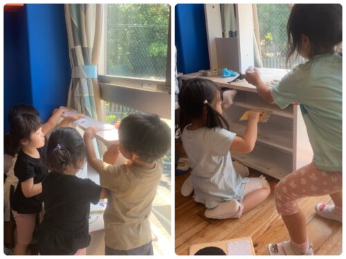 次は、いつもみんなが使っている玩具の棚やおままごとのキッチンなどをピカピカにしました!自分の背より高いところも、手を伸ばして頑張って拭いている姿がとても可愛らしかったです❤️