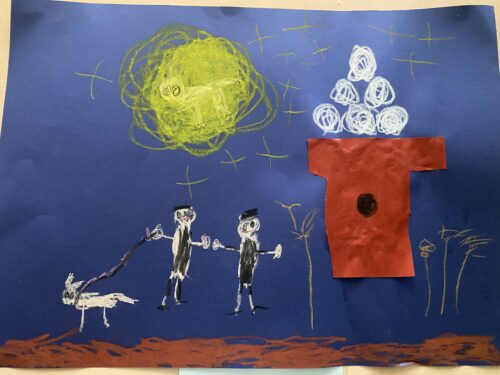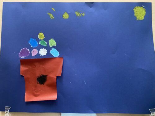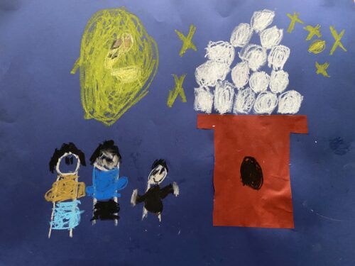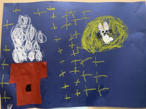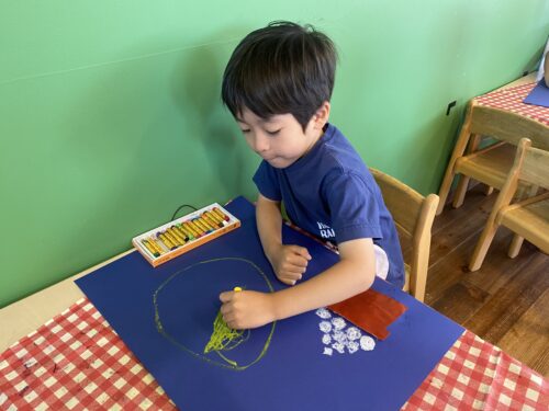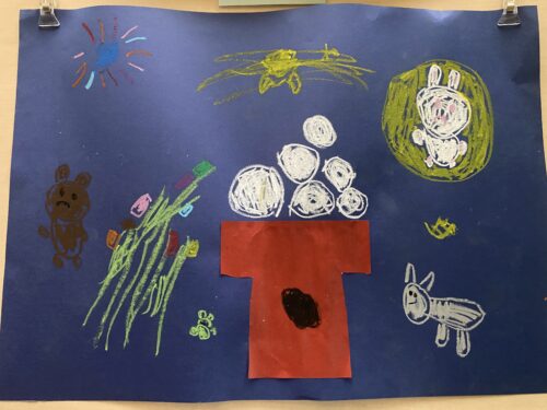 月見団子と月は描いてほしいことを伝えて、あとは子どもたちに自由に表現してもらいました。