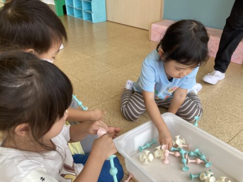 ブロックでお家を作ったり、吸盤のおもちゃを繋ぎ合わせて冠を作ったりとたくさん楽しんだ子どもたち❤️