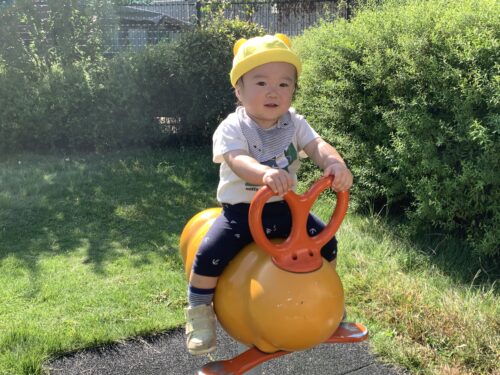ゆらゆら揺れる大型遊具に乗ろうとしたり、植物をみながら笑顔を見せ触ろうと手を伸ばしたり…虫を見つけて目をまんまるにしたりとさまざまな表情がたくさんみれます👀✨