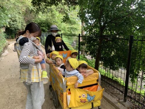 保育士と手を繋いで歩いたり、散歩車に揺られながらノリノリな子どもたちです🌟