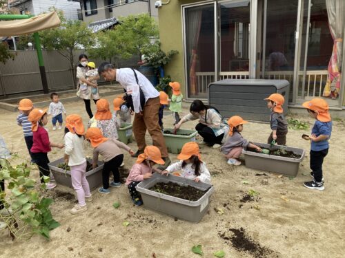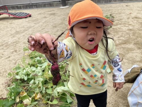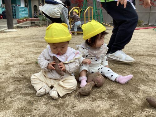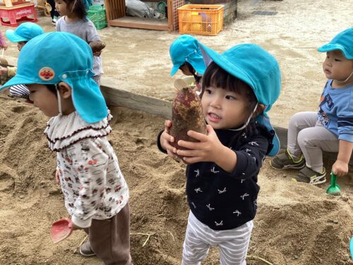 幼児組のお友達が前日に収穫した芋を使って園庭の砂場に埋めて、乳児の友達も芋掘りを楽しみました😊