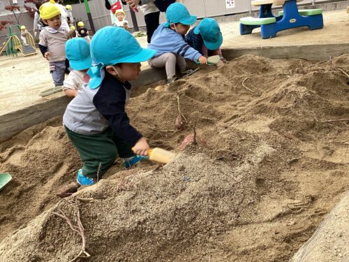 いつも遊んでいる砂場に埋められている芋を見て不思議そうにしたり、警戒しているお友達もいましたがそれぞれスコップを持ち、準備万端です✨