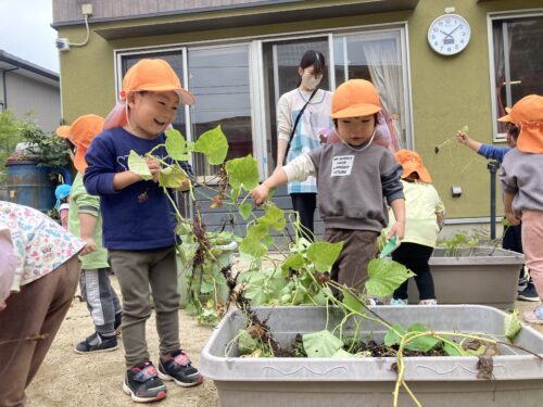 今年は夏の暑さからか、中々の不作でしたが、「ちっちゃいなぁ!😁」と言いながらも、自分で収穫できたことに大満足の子どもたちでした😌✨