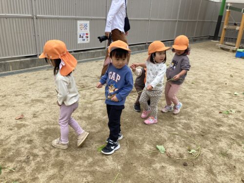 電車ごっこをしたり、運動会での保護者競技の真似っこをして、子どもたちVS保育士での綱引きが始まりました😆