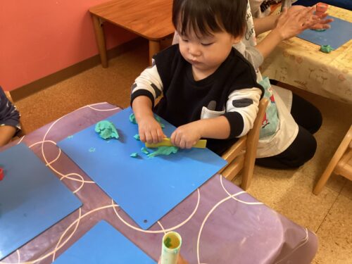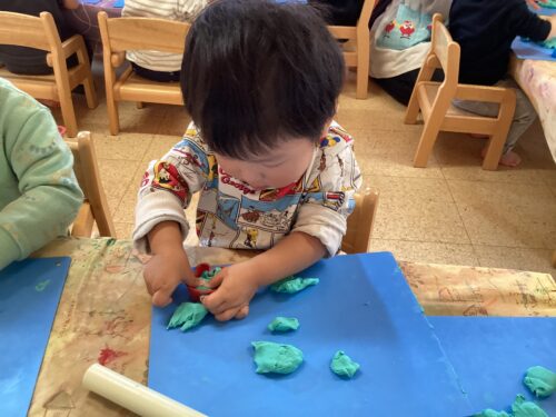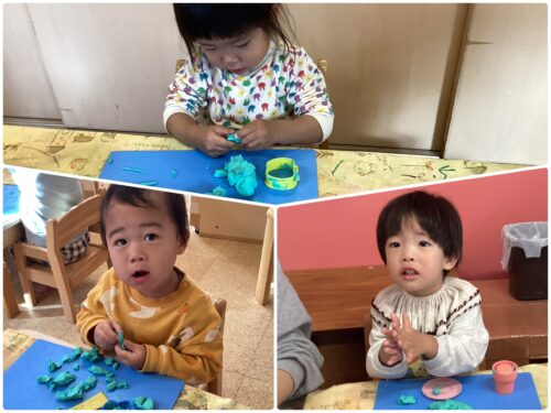 「うさぎできた!」「おにぎりできた!」とそれぞれ思い思いに遊びました。指先や道具を使いながら少しずつ出来ることが増え、自分なりに楽しむ姿に成長を感じました。これからの姿も楽しみです!