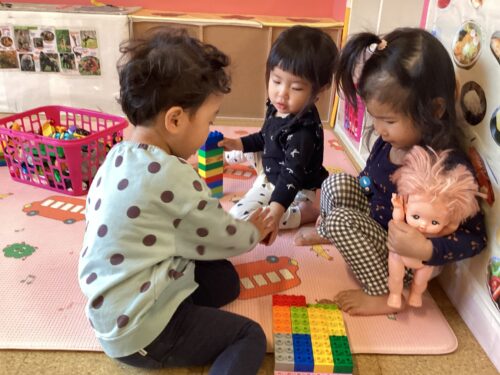 ブロック遊びです。お友だちと「かして」「どうぞ」「ありがとう」と言葉でやり取りしながら3人で協力して高くブロックを積み上げています☺️クラスでも言葉のやり取りが増えてきました🌟