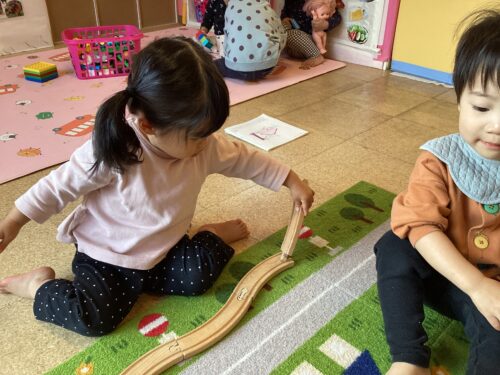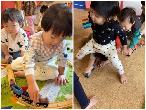 繋げた線路を走らせたり、お友だちの足のトンネルをくぐったり遊びが発展していきました🌟