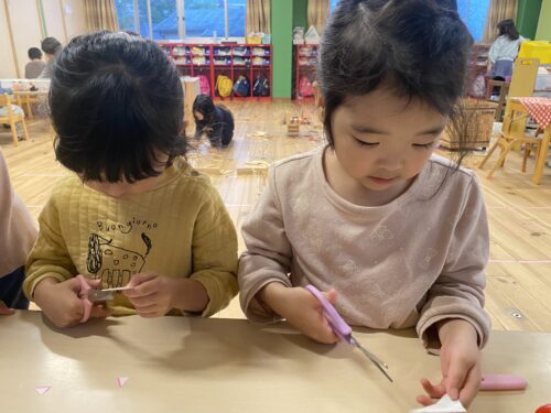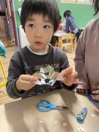 そら組さんには、切り紙をしてもらいました。ハサミを使って上手に点線で切り取り、雪の結晶を作ってもらいましたよ❄️さすが、そら組さんですね!ハサミで丁寧に切ることができていました👏🏻