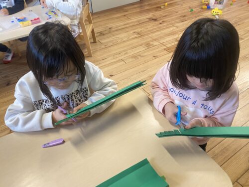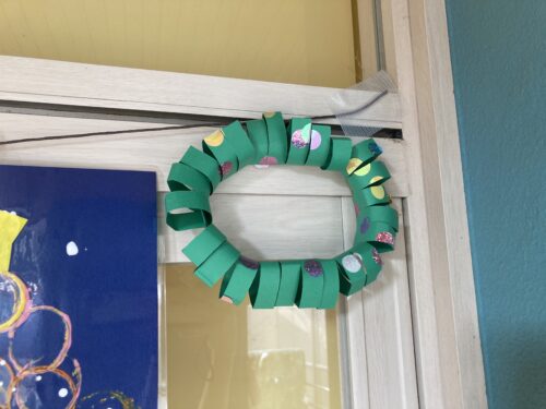 くじら組さんには、切り込みを入れてもらいリースを作りました✨これを丸めると…