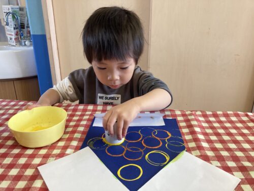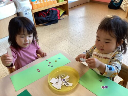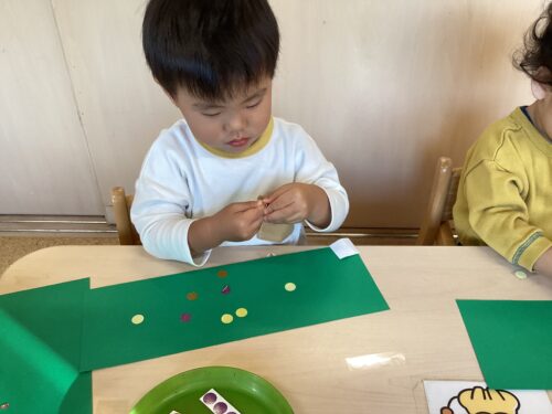だいち組さんには、シール貼りをお願いしました♪これが、後に丸めてリースになります🌟「どのシールにしようかな…💭」と悩みながら真剣に取り組んでいた子どもたちです☺︎