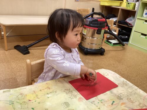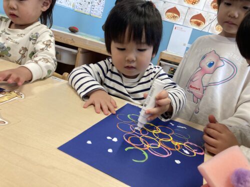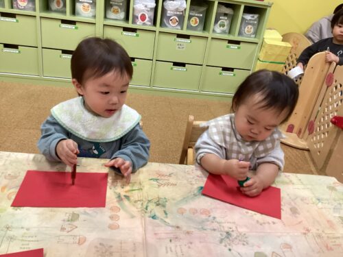 あめ組さんには、ツリーを作ってもらいました(^^)好きな色で丸スタンプをポンポンと押してもらい、その後白いペンで雪を描きました❄️「保育園でも雪降るかなぁ?」と雪が降るのを楽しみに待っているようです😁