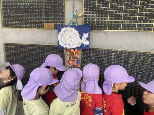 事前に子どもたちと折り鶴を折り、くじらの形をモチーフにして平和を願い作った千羽鶴。
