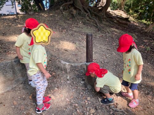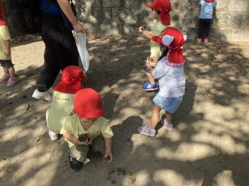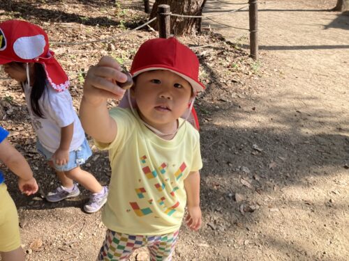 まずはドングリやドングリの帽子、落ち葉を拾ってを楽しみました😊「ドングリあったよ」と嬉しそうにきょろきょろと周りを見て探す子どもたちです。見つけると、「あった!!」「あっちにたくさんあったよ!」とドングリを拾い集めていました。