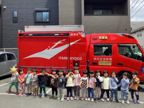 避難訓練の時間の少し前に消防車が保育園に到着です🎵