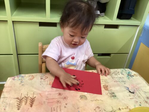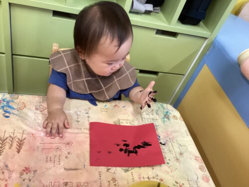 絵の具が手に付くのを不思議そうに見つめたり、『ういー!』と手を叩いて勢いよく色付けしていました👏🏻