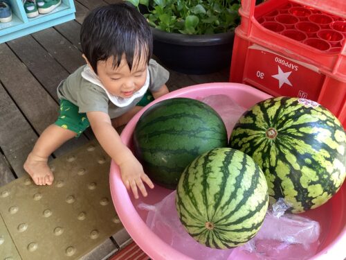 「小さな卵型のスイカは、もしかしたら恐竜の卵かもよ?」と伝えると少し後ずさりしつつ