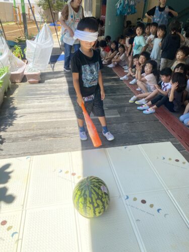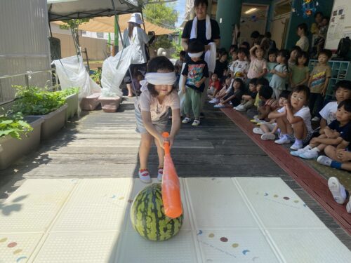 大きなスイカは、4.5歳児さんがスイカ割りを楽しみました。